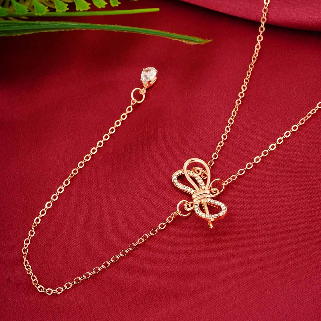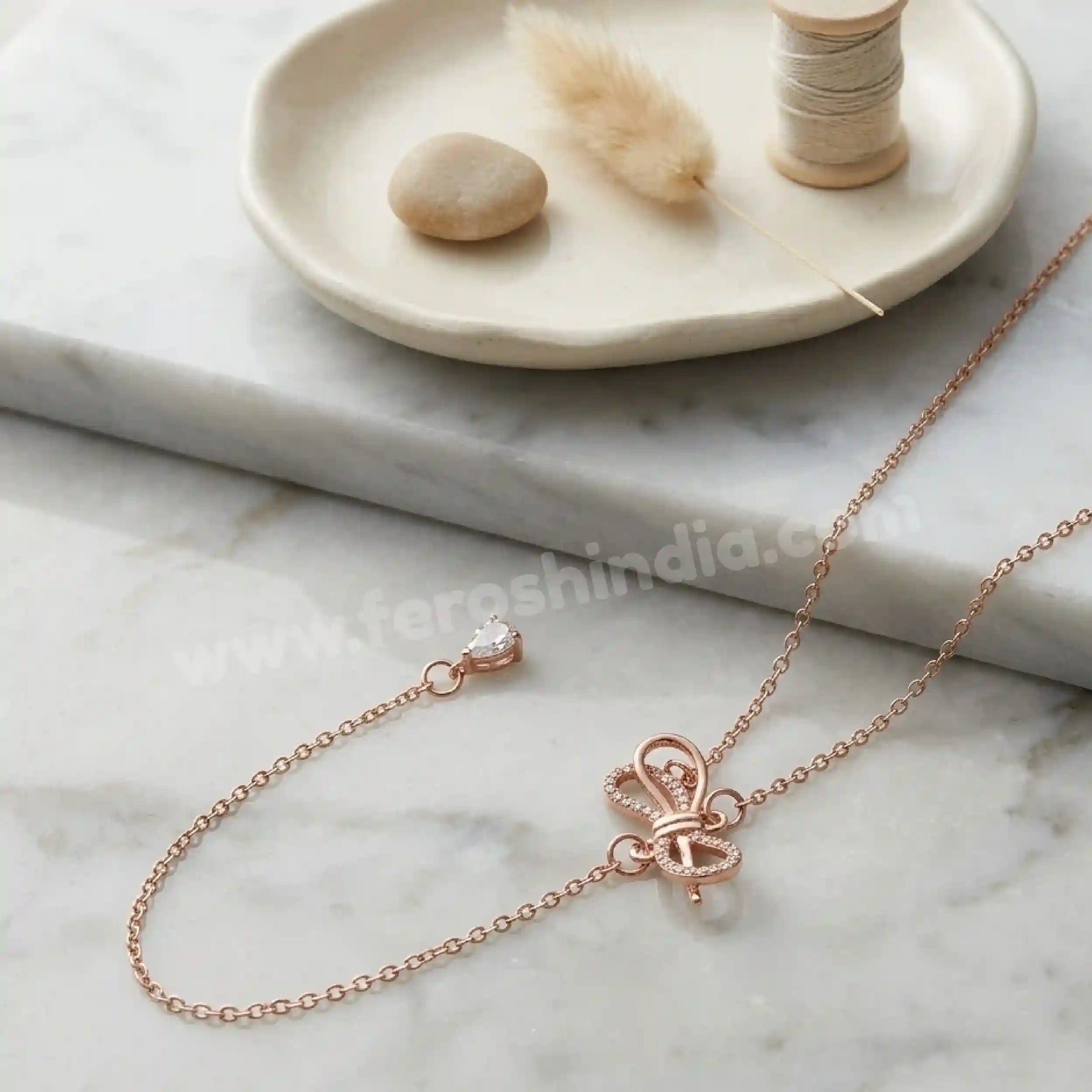 Be the queen of styling casual looks with this beautiful rose golden link chain from the designer house of Ferosh. The rose gold pendant crafted in a cute bow design is adorned with rhinestone embellishments that look absolutely stunning. Make any of your casual looks stand out with this adorable pendant.