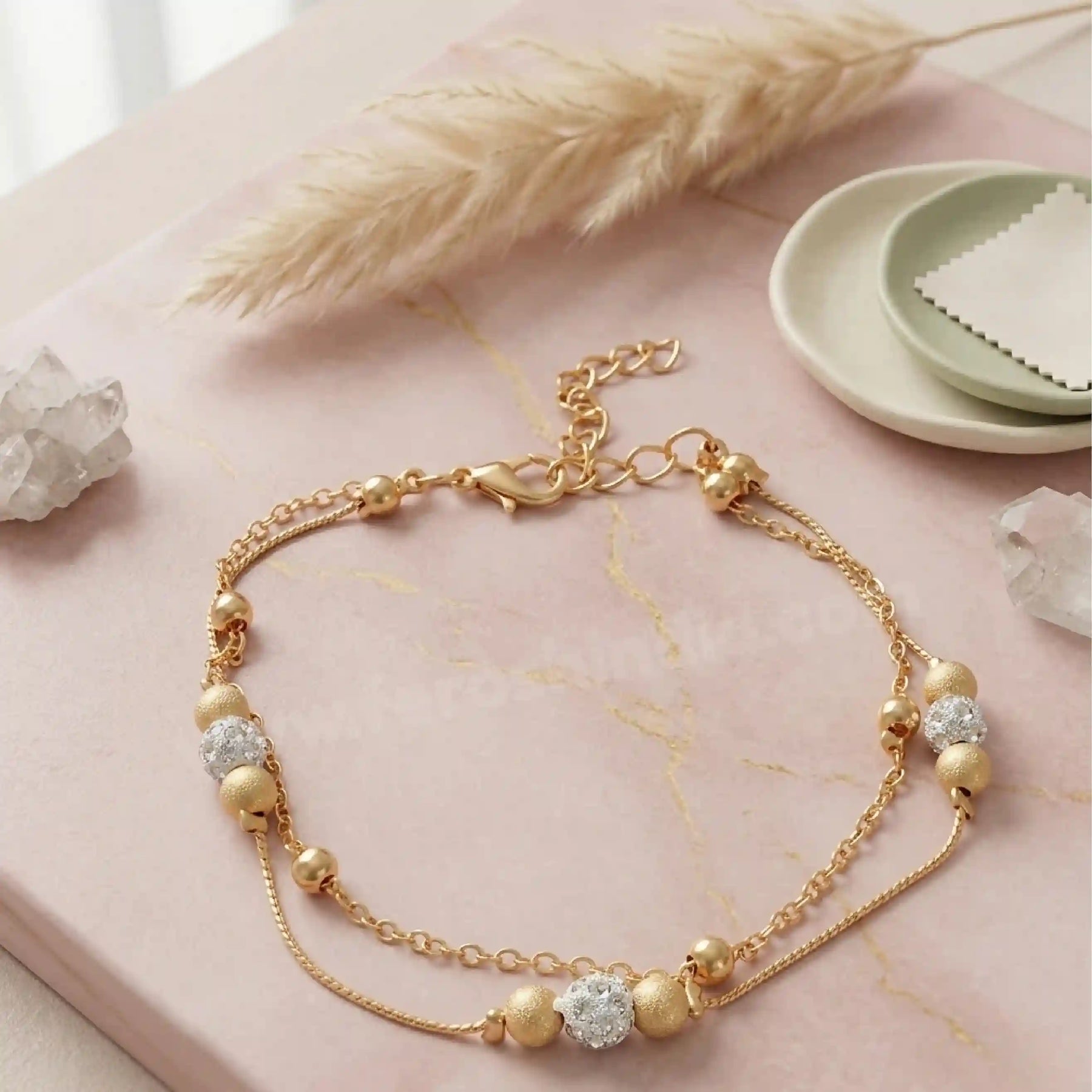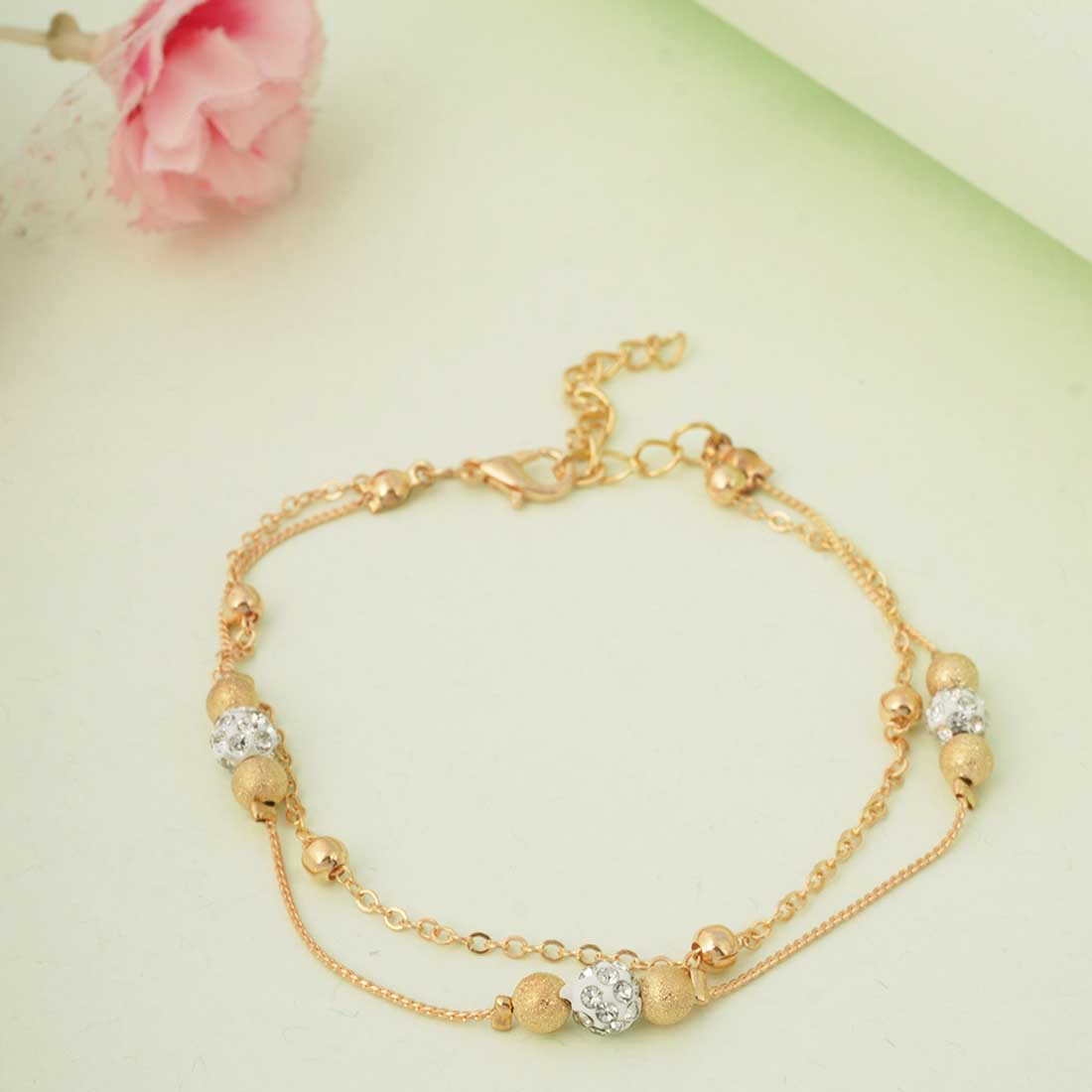 Gold Rhinestone Beaded Layered Anklets are a lovely way to accessorise your feet. These gold anklets have a distinctive design and are handcrafted in mixed metal. Make a statement with them by wearing them with ethnic clothing. Flaunt these uniquely designed crystal anklets by Ferosh to shine like a diva. These gold beads and crystal-studded gold anklets are accented with a simple and contemporary design, exuding matchless elegance. When you match these layered anklets with a striking outfit, you'll be ready to take on the world!