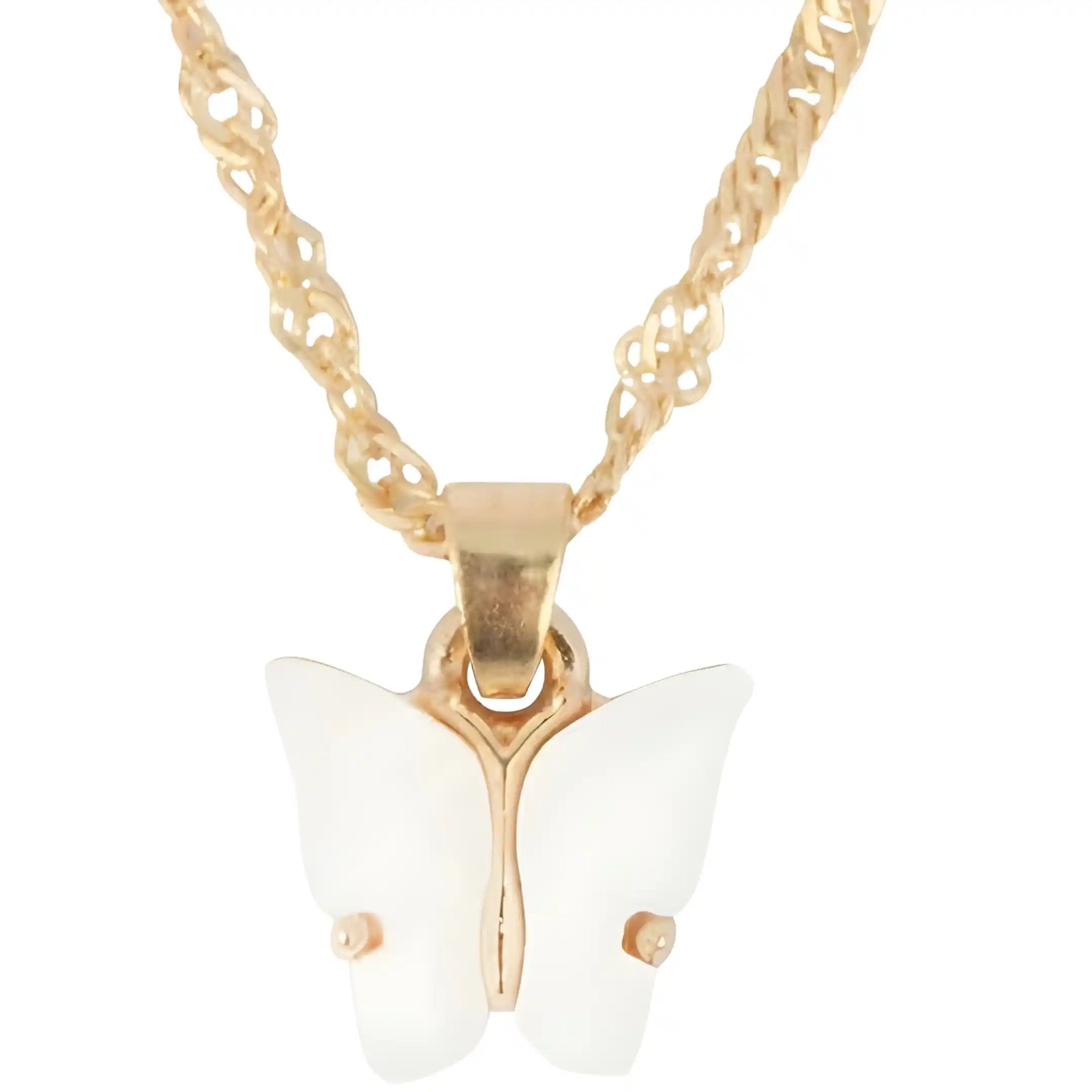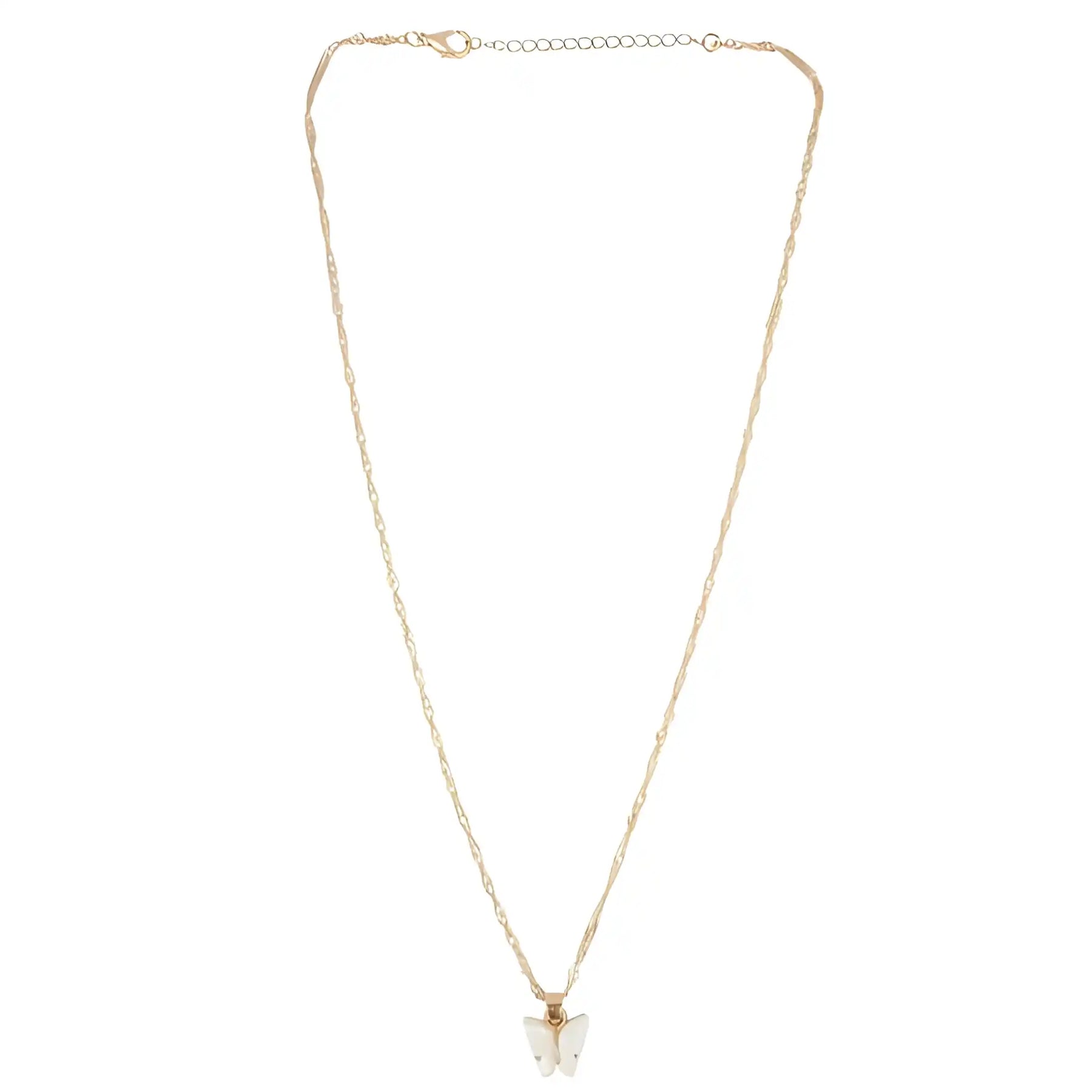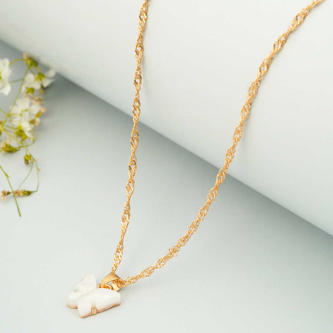 White Stone Butterfly Necklace is a beautifully crafted gold chain necklace presented to you from the exclusive collection of Ferosh. Why leave your neck bare when you can embellish it up with this erudite piece of chain necklace from the designer house of Ferosh. The minimal yet chic gold chain necklace is a staple for your accessories collection. Ameliorate your accessories collection with this beautiful chain necklace. Enhance the beauty of your neck full of panache with this charming piece of chain necklace with a flimsy chain design with an elegant stone butterfly pendant. Don’t waste time and cease your own piece now.